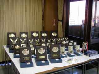 ズラリ並んだ入賞者用の盾。 今回は遠方の方が持ち帰りやすいようにとトロフィーをやめて、バックルにしました。 部門賞も5位まで表彰される事になりました☆ |