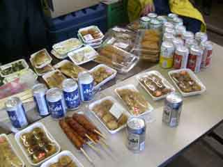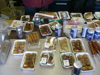 競技が終わったら、集計を待たずに御片づけ! 忘年会のプレ大会…じゃなくて、ALL-JAPANの反省会です。 ズラリ陳列した料理の数々。 今回はスーパーのお惣菜が主になります(こういうのも好き)。 |