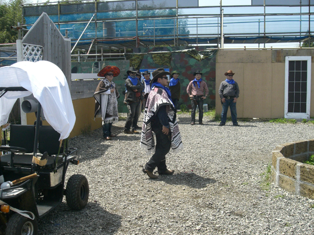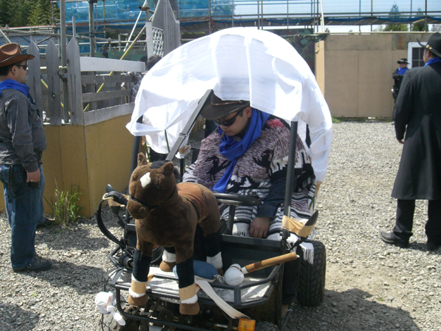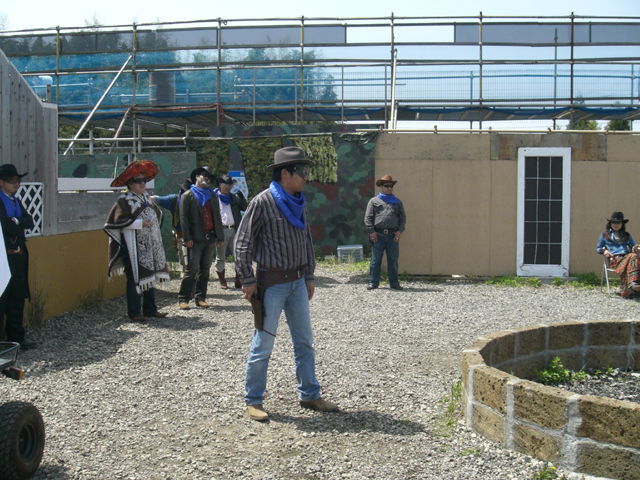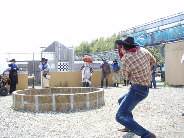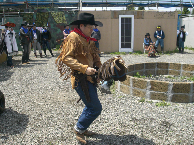 とにかく走り回ってヘロヘロになった頃、休憩かねて(?)「早撃ち決闘トーナメント」が始まりました。 写真は“騎兵隊 Vs 荒野の早撃ち旅芸人”による騎馬戦。 |