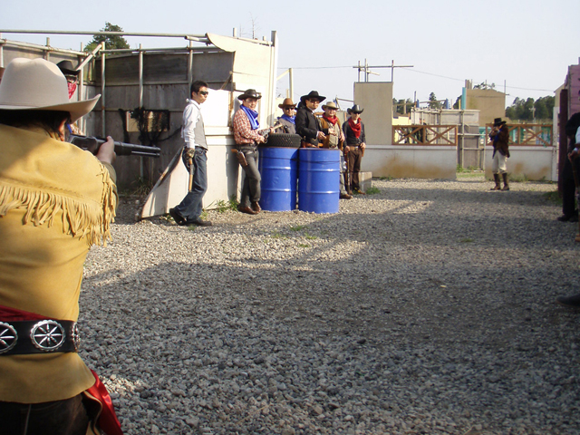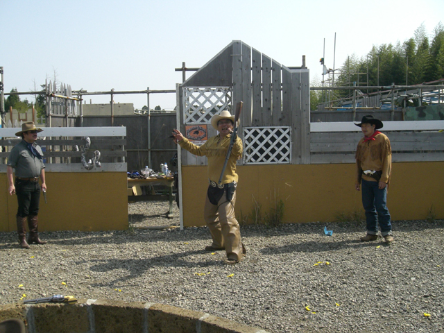 久々らしい、ライフル対決。 お互い背中を向けて10歩ずつ…。 拳銃での早撃ち対決とは明らかに距離が遠いので、また違った技術が必要なようです。 |