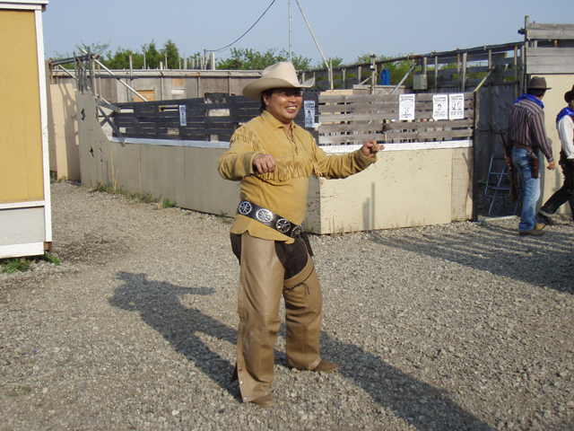 ウィンチェスターM73のノーマルレバーで回せるか!? 見学者の体験に名乗り出たkamikazeさん。 「痛ぇ〜! 指が〜!!」と、さすが分かってらっしゃる(笑) |